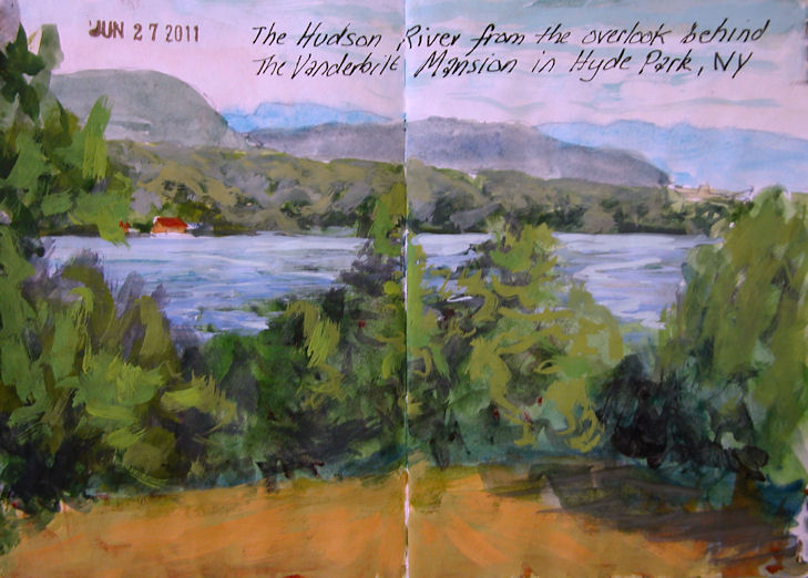 This sketch was painted on location behind the Vanderbilt Mansion in Hyde Park, New York. It is watercolor and gouache, done in the sketchbook provided for The Sketchbook Project 2012, so it will be part of my book that will go on tour and reside in the Brooklyn Art Library.