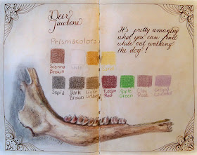 While out walking last weekend, my husband and I came upon an area covered with tan and gray fur. There in the middle were both jawbones from a deer that must have fallen victim to a pack of coyotes or some other wild animals. It was pretty creepy, but wow, what a sketching subject! I had to bring this back to the studio. Colored pencils seemed an ideal medium for some of the details and subtle coloring of the subject.